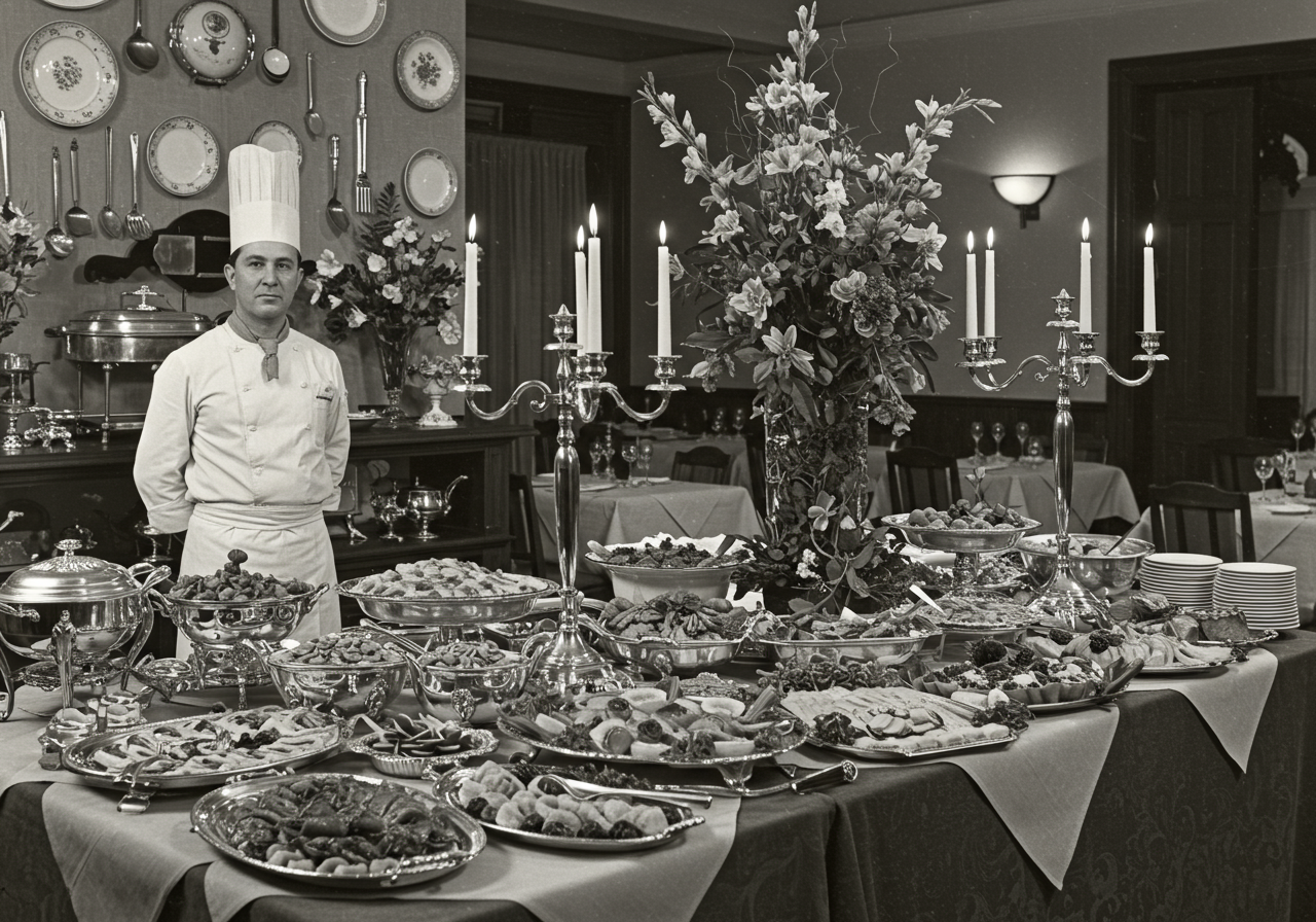 was very elegant with paneled woods, copper and brass fixtures, royal blue and white china, and crystal vases. The principal decorations were coats of arms. Food specialties here included "Lammesaddel", "Viking Sword", "Hamlets Dagger" (fresh lobster pieces non-greasy fried with exquisite tartar sauce), and Danish pastries. Restaurant had an award-winning wine cellar that boasted over 30,000 bottles of wine in the '80s. Even Josh and Alison couldn’t make a dent in their collection if it were still around today. From 1950 through 1980, this restaurant received Holiday Magazine awards. also received many other accolades for the cuisine that whetted customer’s palettes and made them come back again and again.